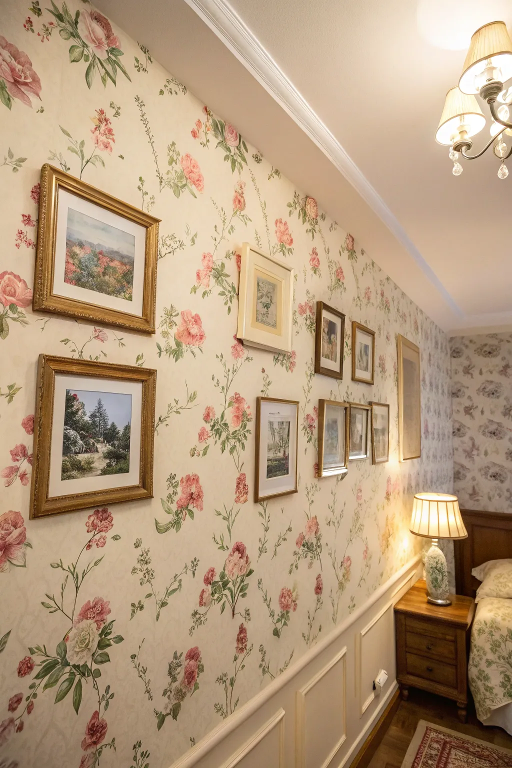 Position your pictures against a floral design for a classic, vintage-inspired theme. This imparts sophistication to my guest bedroom.