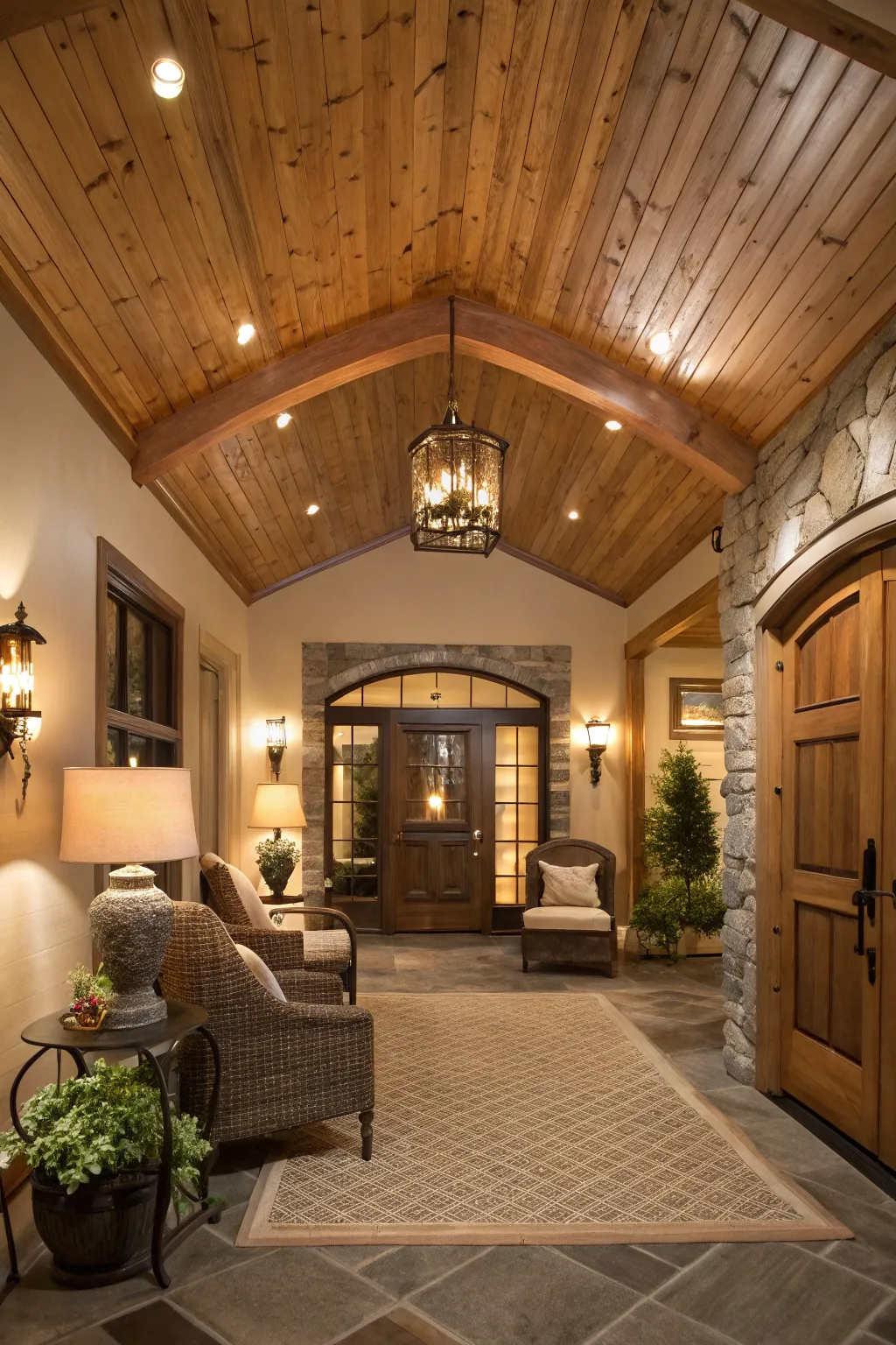 Welcome visitors with a warm entryway featuring a pine planked ceiling. It sets a welcoming tone right at the front door.
