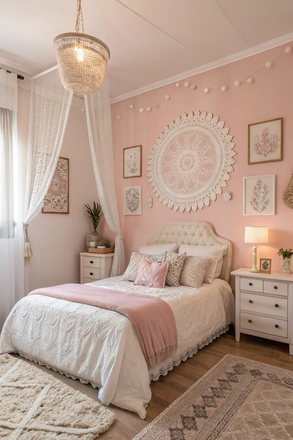 Elegant white lace details paired with soft pink walls create a classic and romantic bedroom. This combination adds vintage charm with a touch of modern elegance.