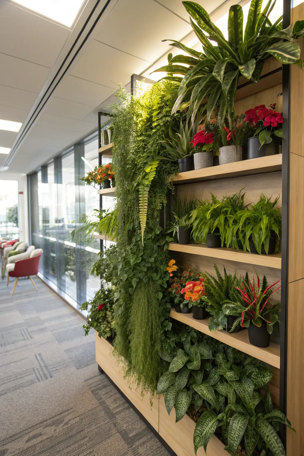 • Timber Tiered Greenery Display: Use elegant wooden tiers to create a warm, natural look for your favorite office plants.