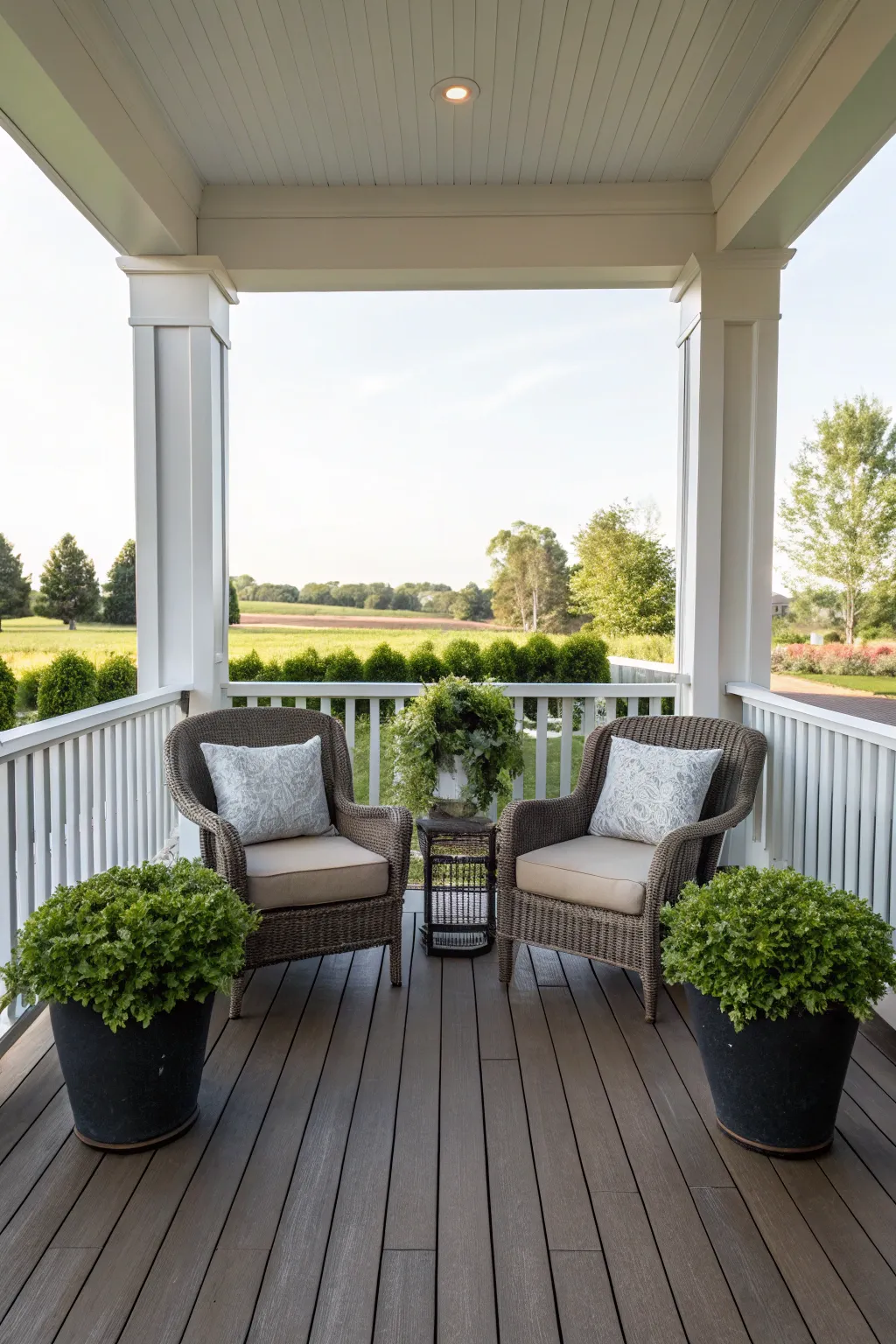 - Paired Rattan Chairs: Establish a harmonious seating area with paired rattan chairs to enhance your porch’s balance.