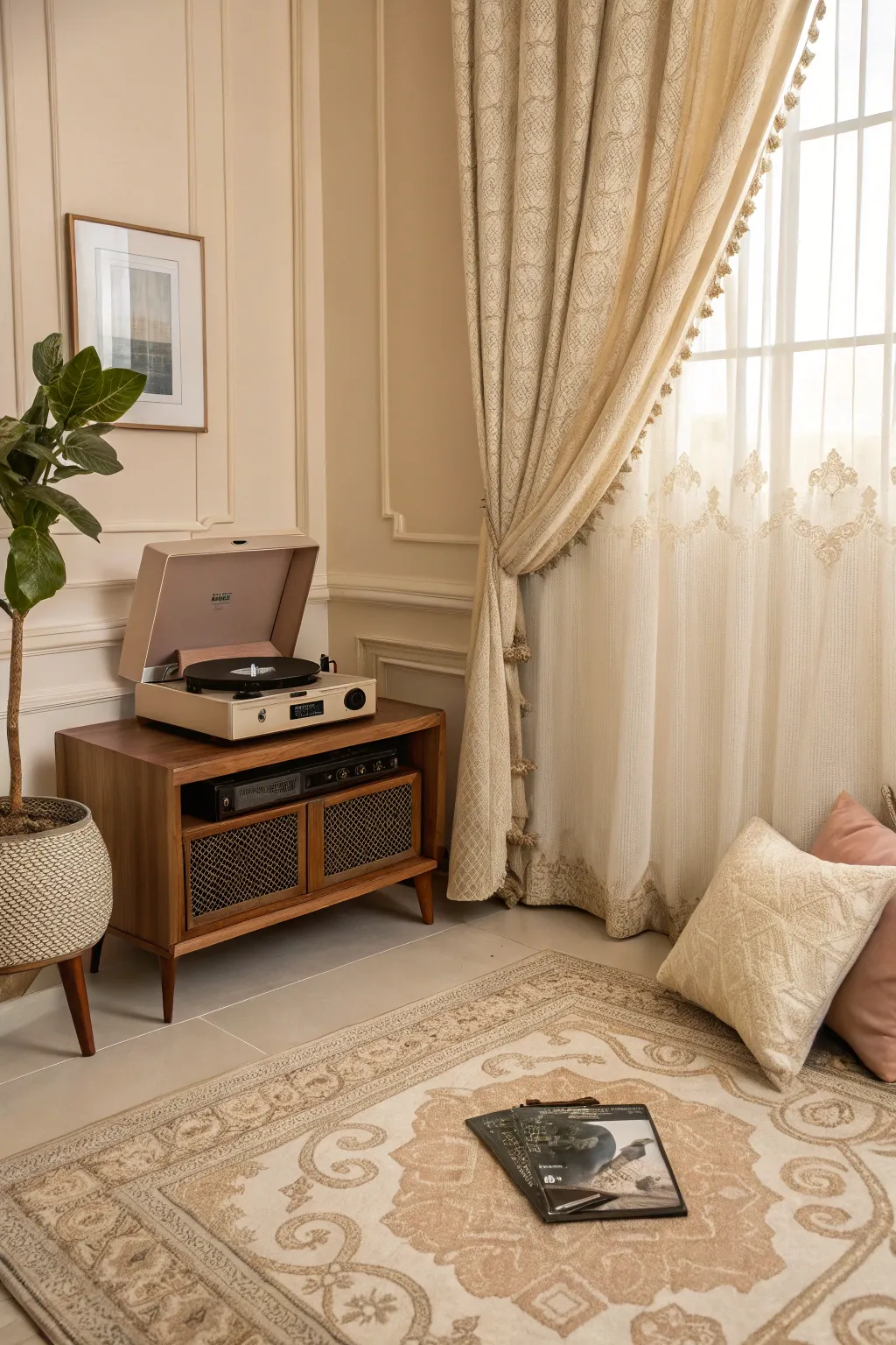 Use a corner for a small setup to make the most of little space. Add a corner shelf or small table to keep your record player and music neat.