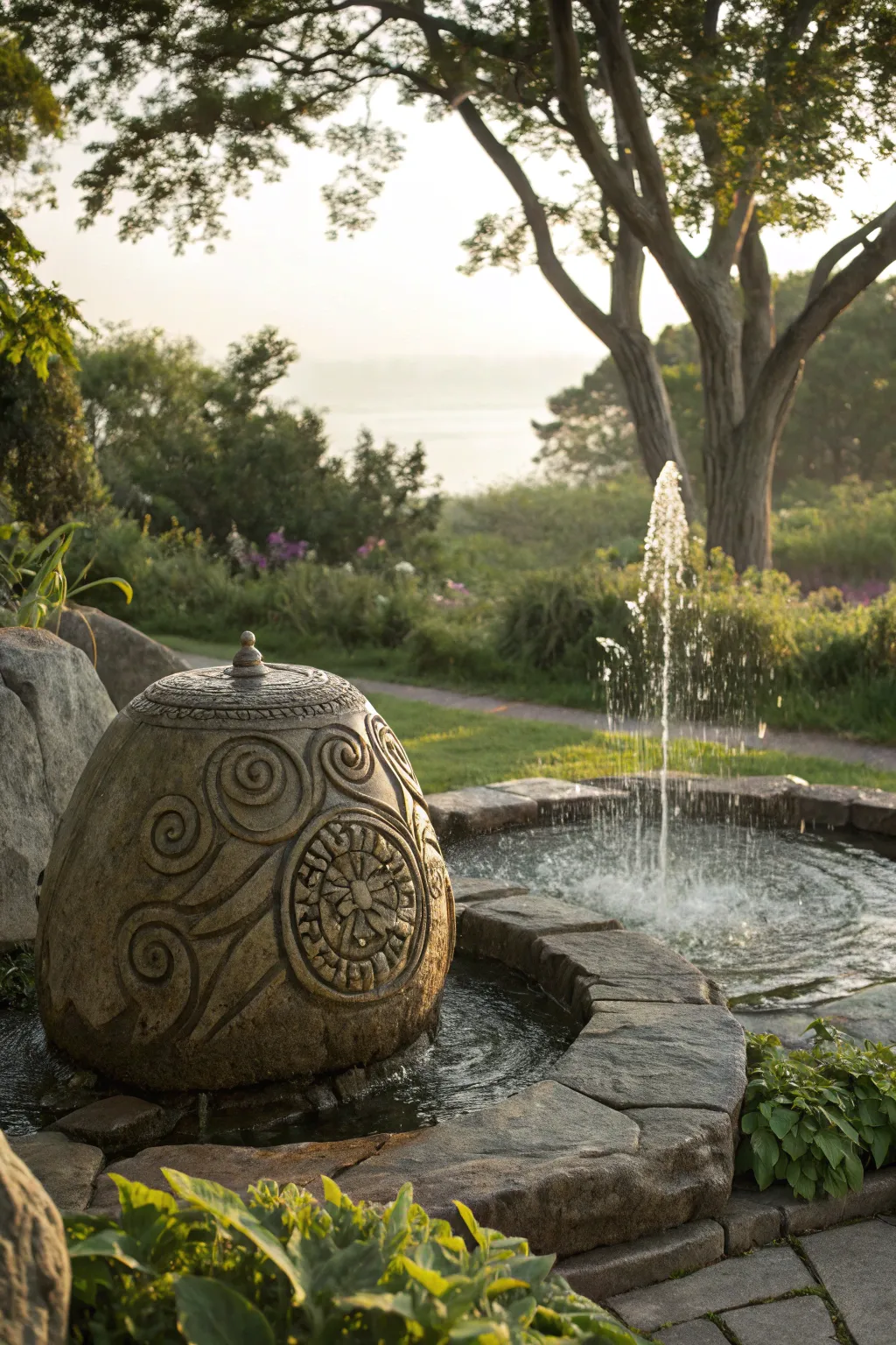 Cultural accents contribute profundity and intrigue to this garden fountain.