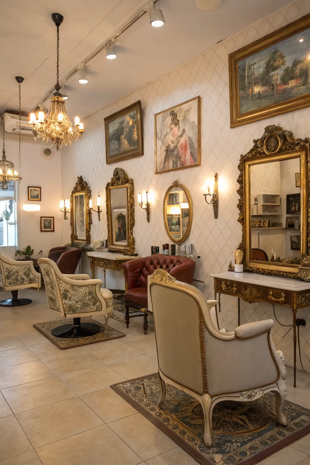 - Gilded Antique Mirror: Incorporate elegance and charm into your salon with this stunning, discussion-starting vintage gold mirror.