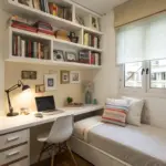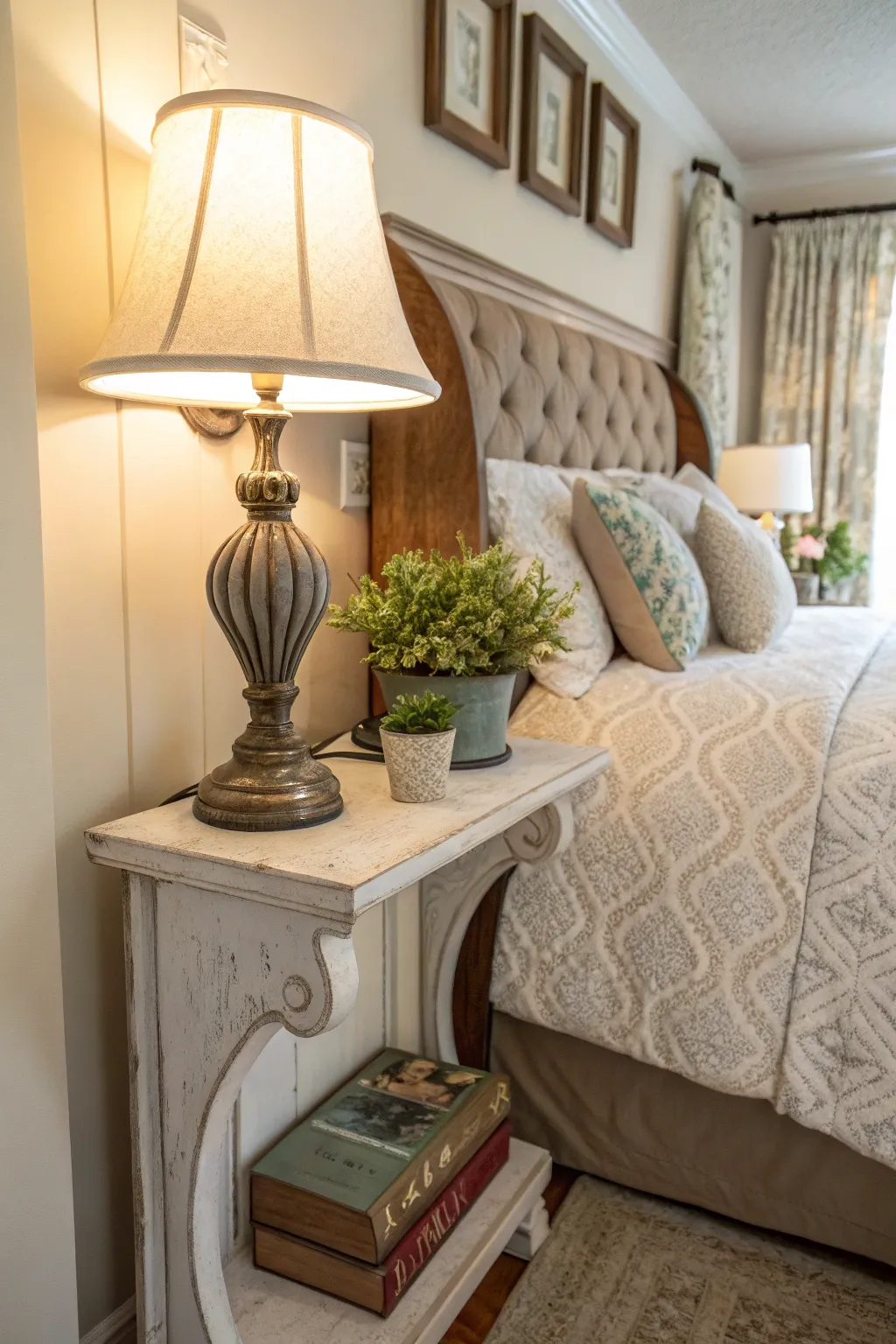 Employ a resilient bracket shelf in place of a stand for a chic, zone-conserving resolution. I cherish how this arrangement preserves my bedside must-haves within arm’s span, free from clutter.