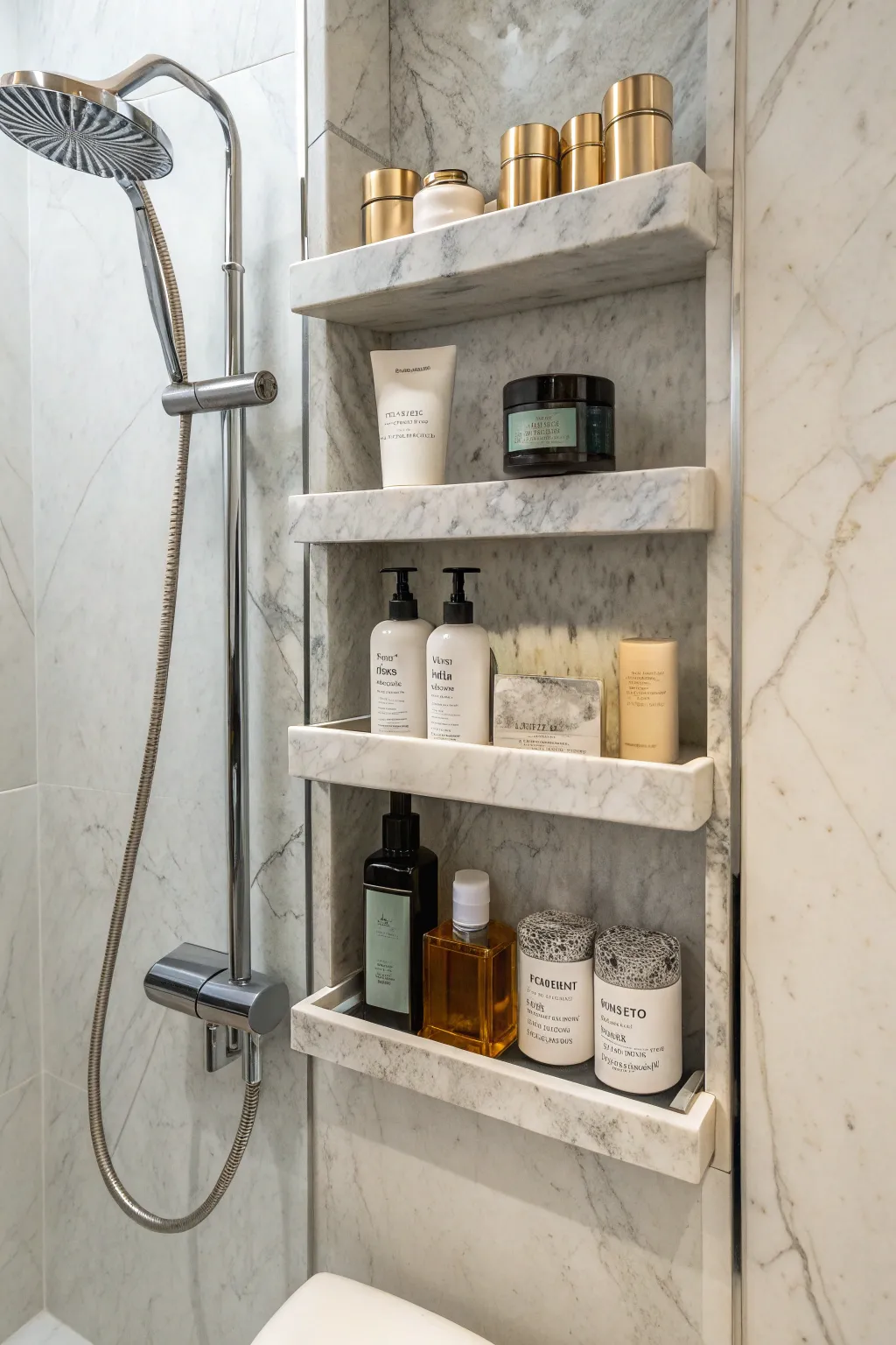 A straight stone alcove running the length of your shower provides a smooth, streamlined storage option. I’ve found this design perfect for a minimalist feel that doesn’t skimp on usefulness.