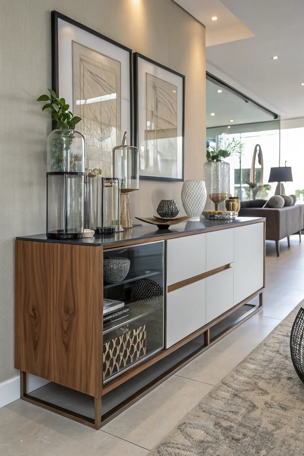- Encased Conceptual Wall Art: Incorporate intrigue with conceptual wall art to enhance your sideboard’s minimalist aesthetic.