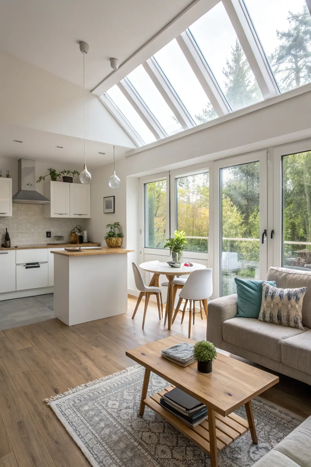 Implementing an open-plan design has the power to make even the coziest areas feel more spacious. I’ve observed that integrating the cooking, eating, and lounging zones is exceptionally effective in optimizing the area, fostering a welcoming and shared atmosphere.