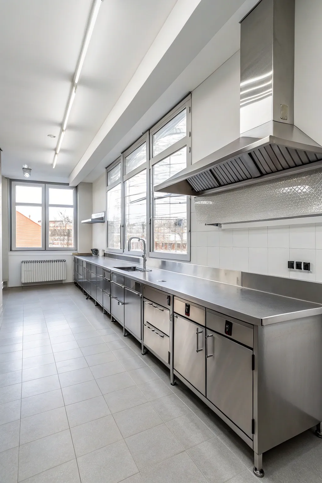 Create your kitchen with a practical layout, employing stainless steel to improve movement and operational efficiency. This ensures that the area is both visually appealing and highly functional.