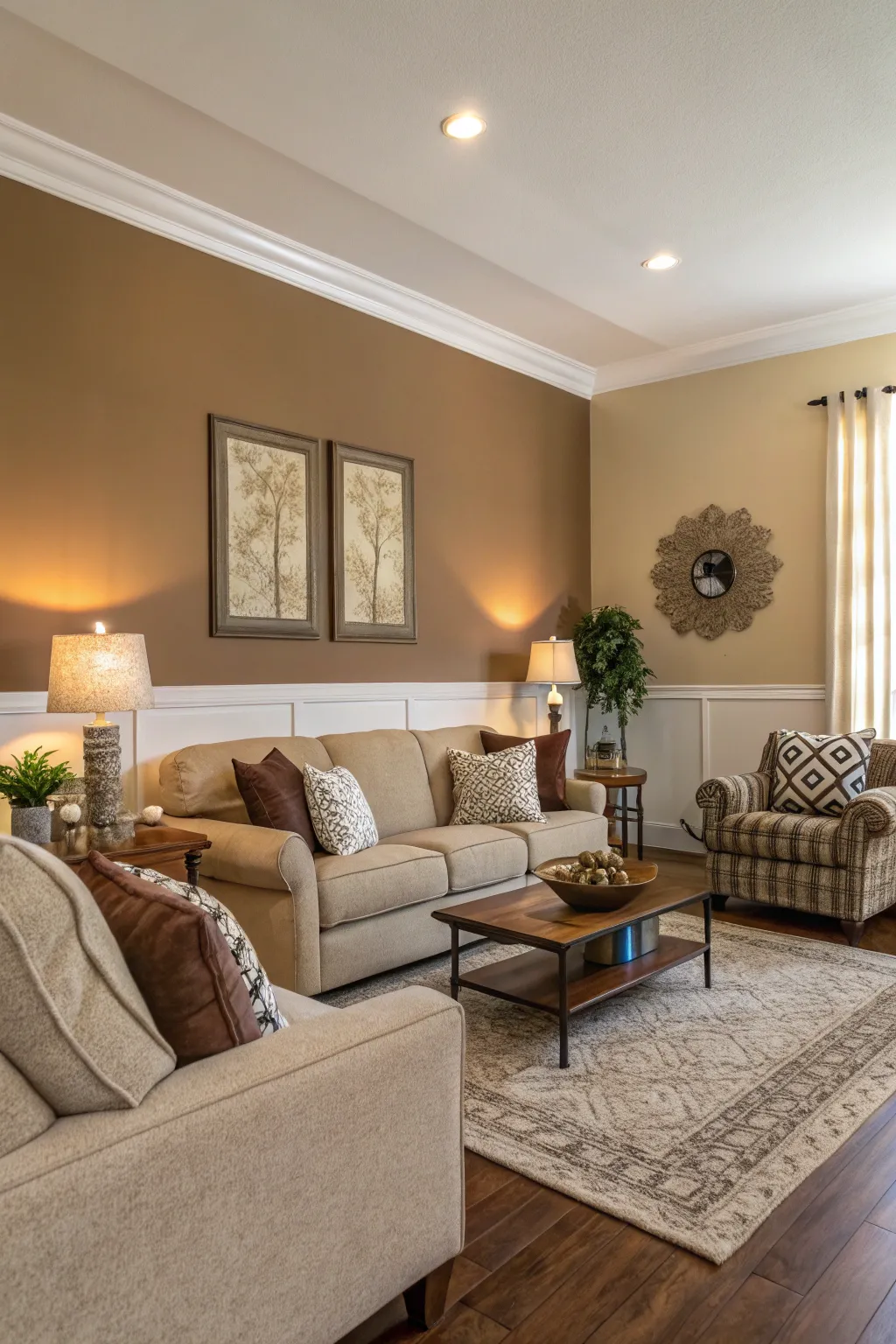 For those looking to visually segment an open area, a vertical two-tone treatment might just be the ticket. I put this to work in my creative hub, mixing a subtle green with a comforting beige to delineate the work area from the relaxation corner.