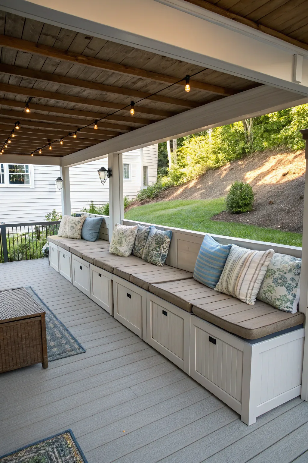 Construct a tidy and sealed storage zone beneath your deck with timber sheathing. This strategy not only conceals clutter but also blends smoothly with the surrounding environment, which I believe gives a touch of class.