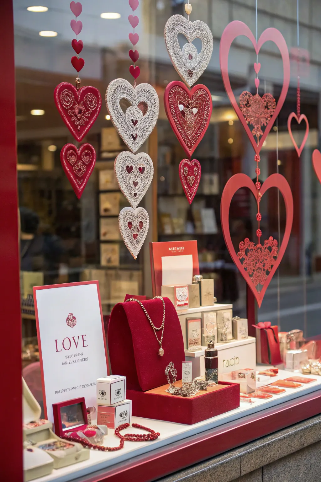 A store window beautifully decorated with an array of heart-shaped ornaments for Valentine's Day.