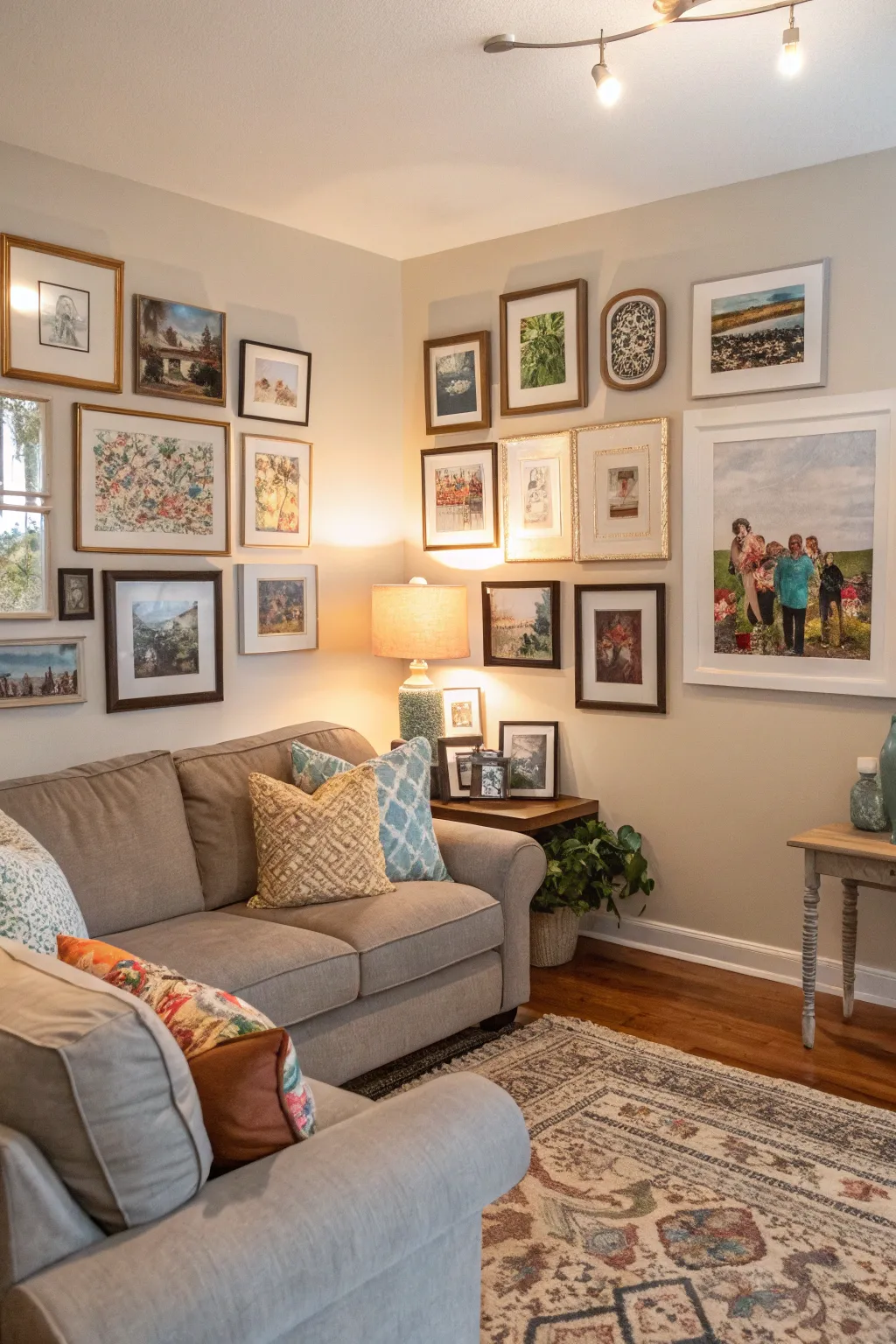 Gather your favorite art pieces or photographs and arrange them to create a unified gallery wall. It’s one of the best ways I know to showcase cherished memories and art without overspending.