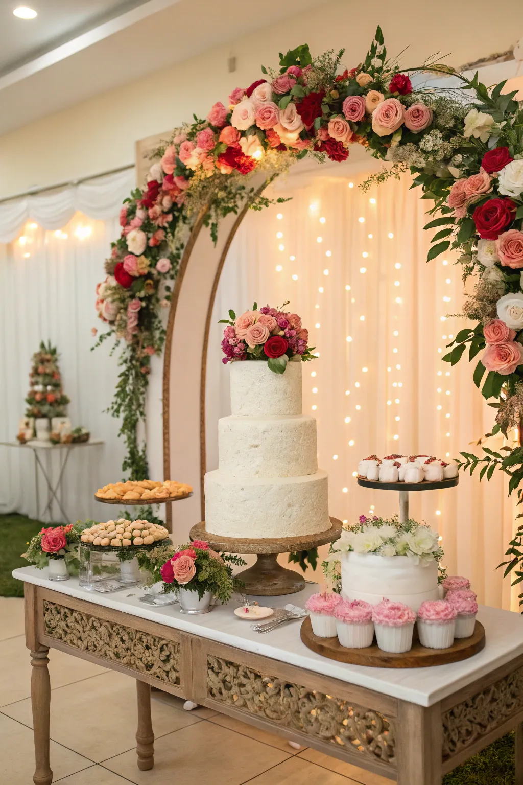 Design a stunning themed stage to frame your cake arrangement. I once crafted a floral arch that turned the cake table into the room’s focal point.