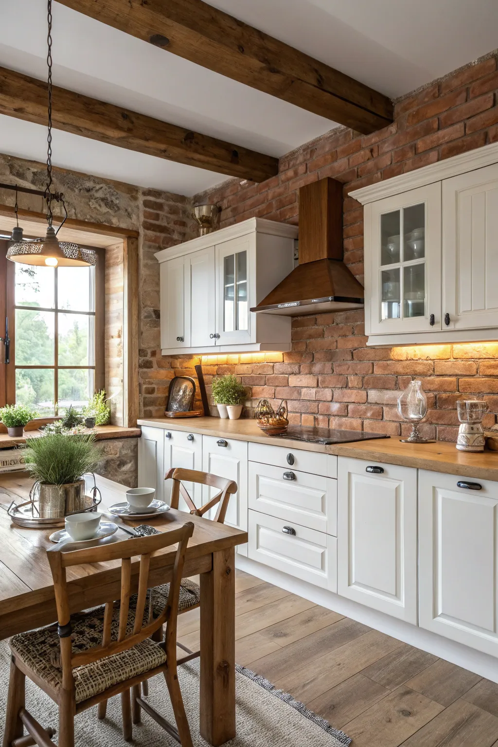 Incorporate a touch of countryside allure with a weathered stone backsplash. It provides texture and coziness, presenting a delightful juxtaposition against the sleekness of white cabinets.