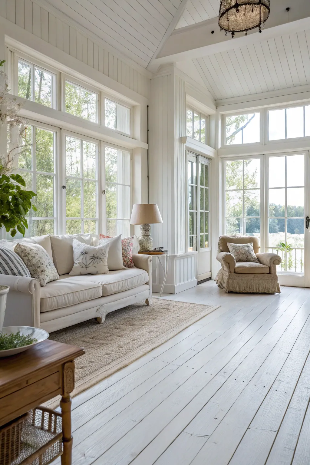 Combine your white wood floors with expansive windows to let in sunlight. This pairing results in a radiant and airy ambiance that feels both stimulating and peaceful.